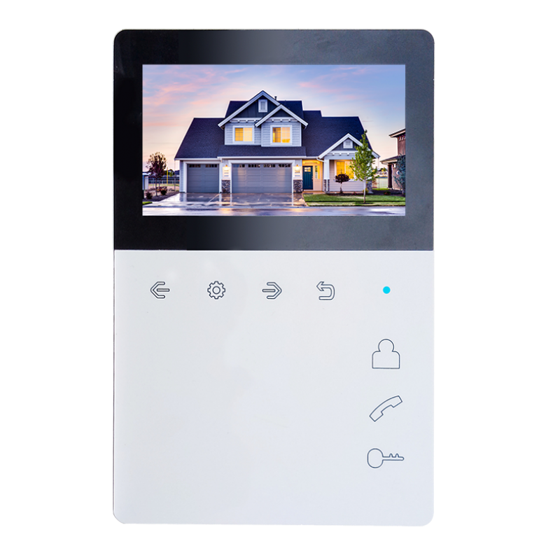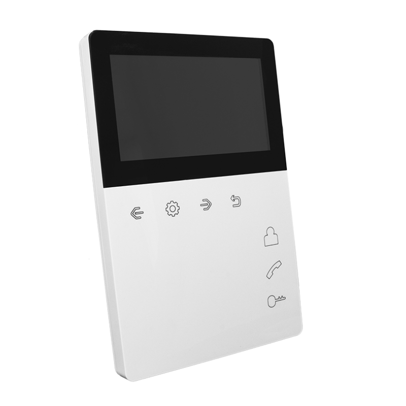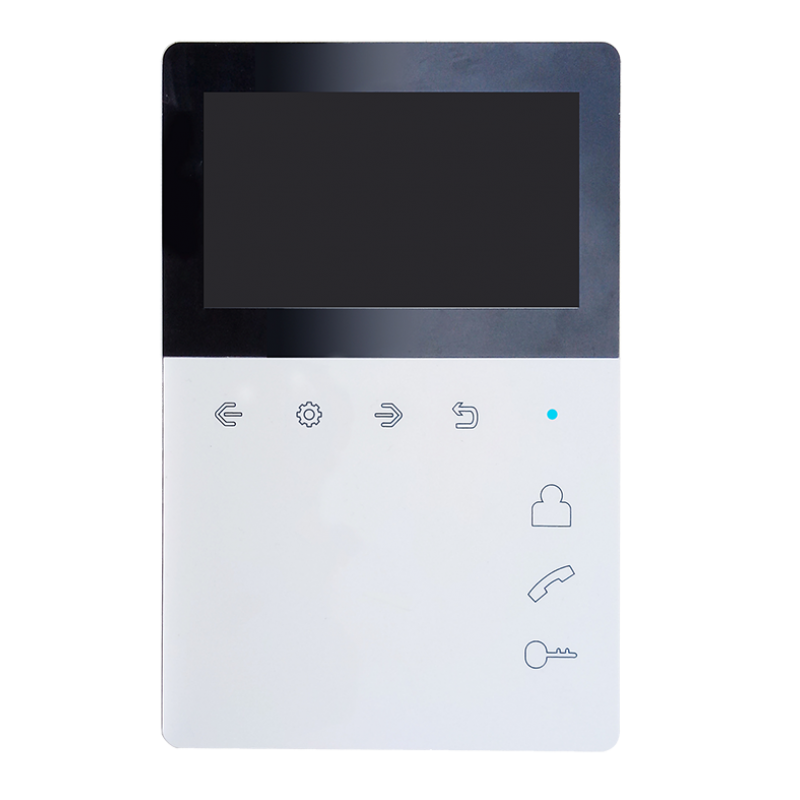 Монитор цветного видеодомофона, экран 4,3 дюйма, сенсорные кнопки, встроенный блок питания, вертикальное исполнение. TFT LCD 4,3" 480x272, PAL/NTSC, Hands-Free, 2 панели и 2 камеры, до 4-х шт. в параллель. Питание 220В. Габариты 118х180 х27мм